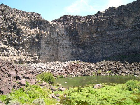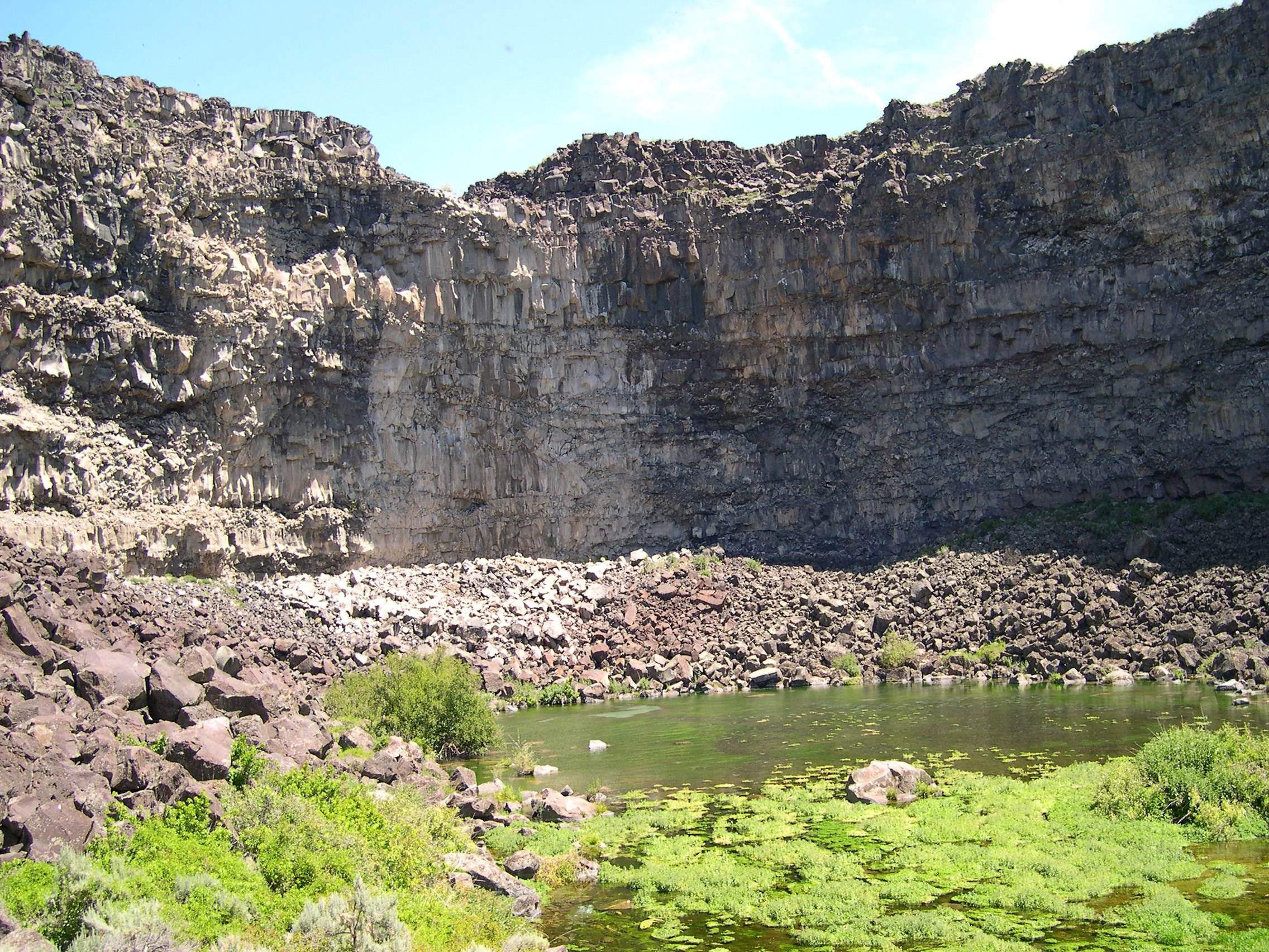 Canyons in Malad Gorge State Park, Idaho, are carved into a relatively flat plain composed of a type of volcanic rock known as basalt. The basalt originated from a hotspot, located in what is now Yellowstone Park, which has been active for the last few million years. Two canyons in Malad Gorge, Woody's Cove and Stubby Canyon, are characterized by tall vertical headwalls, roughly 150 feet high, that curve around to form an amphitheater. Other amphitheater-headed canyons can be found nearby, outside the Gorge—Box Canyon, Blue Lakes Canyon, and Devil's Corral—and also elsewhere on Earth, such as in Iceland.